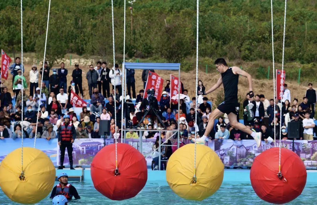 10月5日上午9點整,由泰山文旅集團與山東省廣播電視臺綜藝頻道聯合舉辦的《快樂向前沖》在泰山桃花源景區正式開賽。當日,來自全國各地的1000余名參賽選手、8000余名觀眾齊聚一堂,現場感受運動的樂趣與挑戰;顒娱_始,往屆“快沖”闖關老將們進行了精彩的闖關表演,贏得了在場觀眾們的陣陣歡呼聲與掌聲。選手們紛紛上場,在闖關途中“各顯神通”,現場氣氛歡快熱烈。